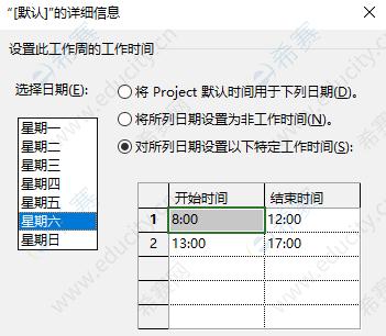 1.打开软件,点击项目,在菜单栏中更改工作时间、工作周、默认,选择周六和周,选择右上角的第三个“为列出的时间段设置以下具体工作时间”,输入想要设置的时间,点击确定,完成设置。