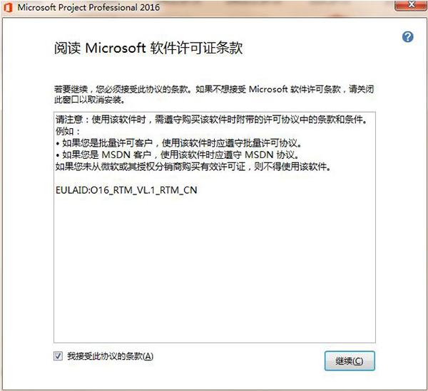 2.进入Pject 2016软件许可协议界面,如下图所示,必须先勾选软件左下角的“我接受本协议”选项,然后点击右下角的“继续”选项。