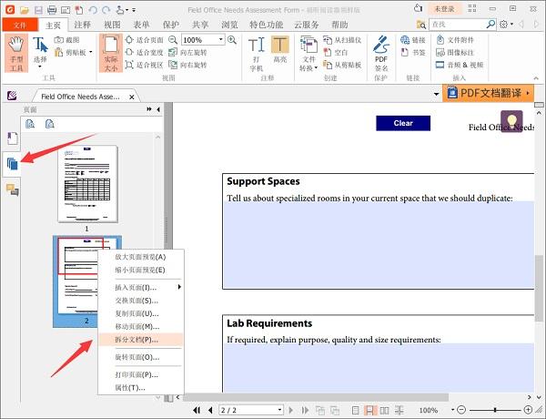 2.点击左侧缩略图,选择任意页面,右键选择“拆分文档”;