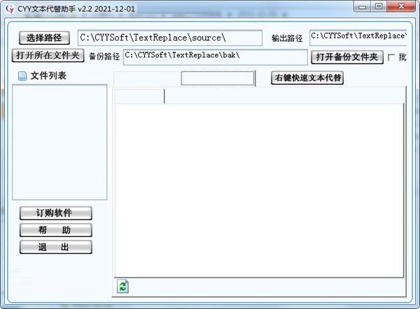 CYY文本代替助手是一款实用的文件处理软件。CYY文本代替助手最新版本有还原功能。文件文本批量替换后,可一键恢复原文件或文件夹。CYY文本代替助手版本可以批量替换选中的文件,也可以替换整个文件夹下所有子文件夹中的所有文件,软件操作简单,使用方便。
